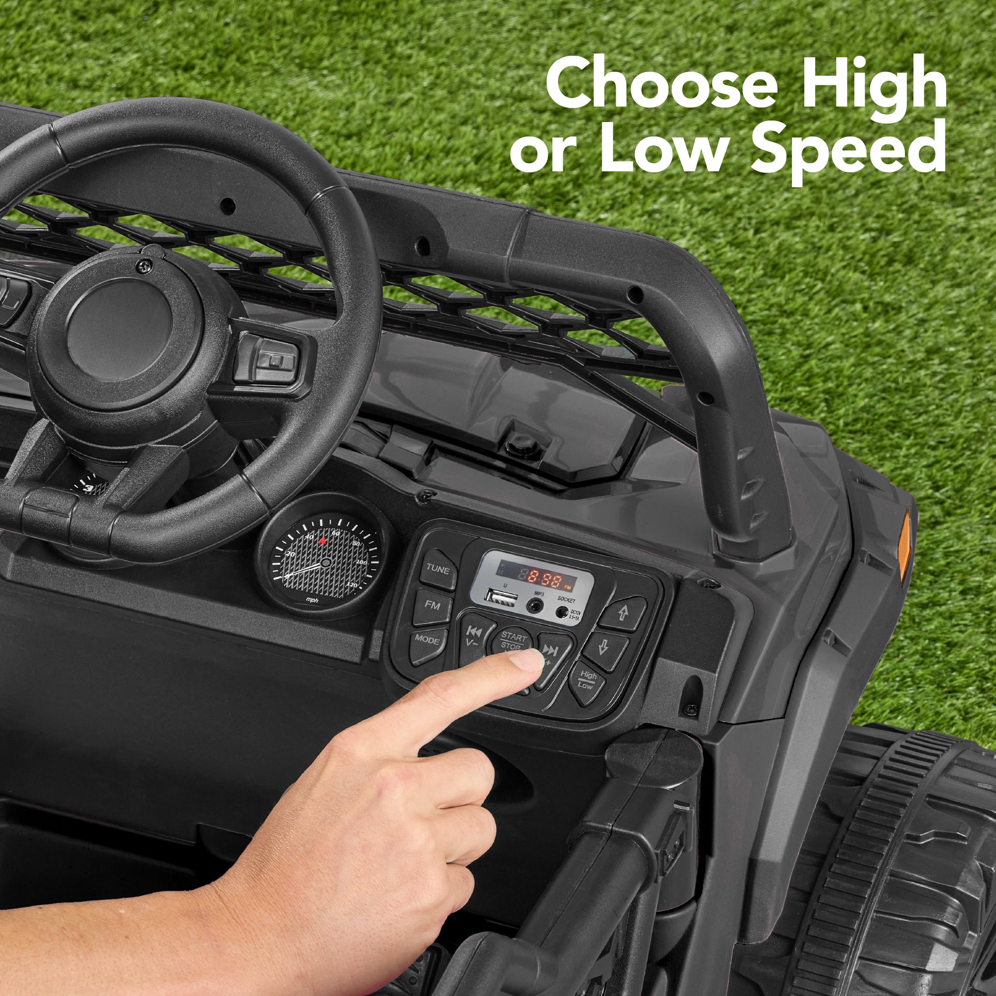 - CHILD-FRIENDLY DESIGN: Made to seat one child, this ride-on includes an adjustable seat harness to secure your child while in motion, treaded plastic wheels, LED headlights, and 2 driving speeds to suit your child's needs