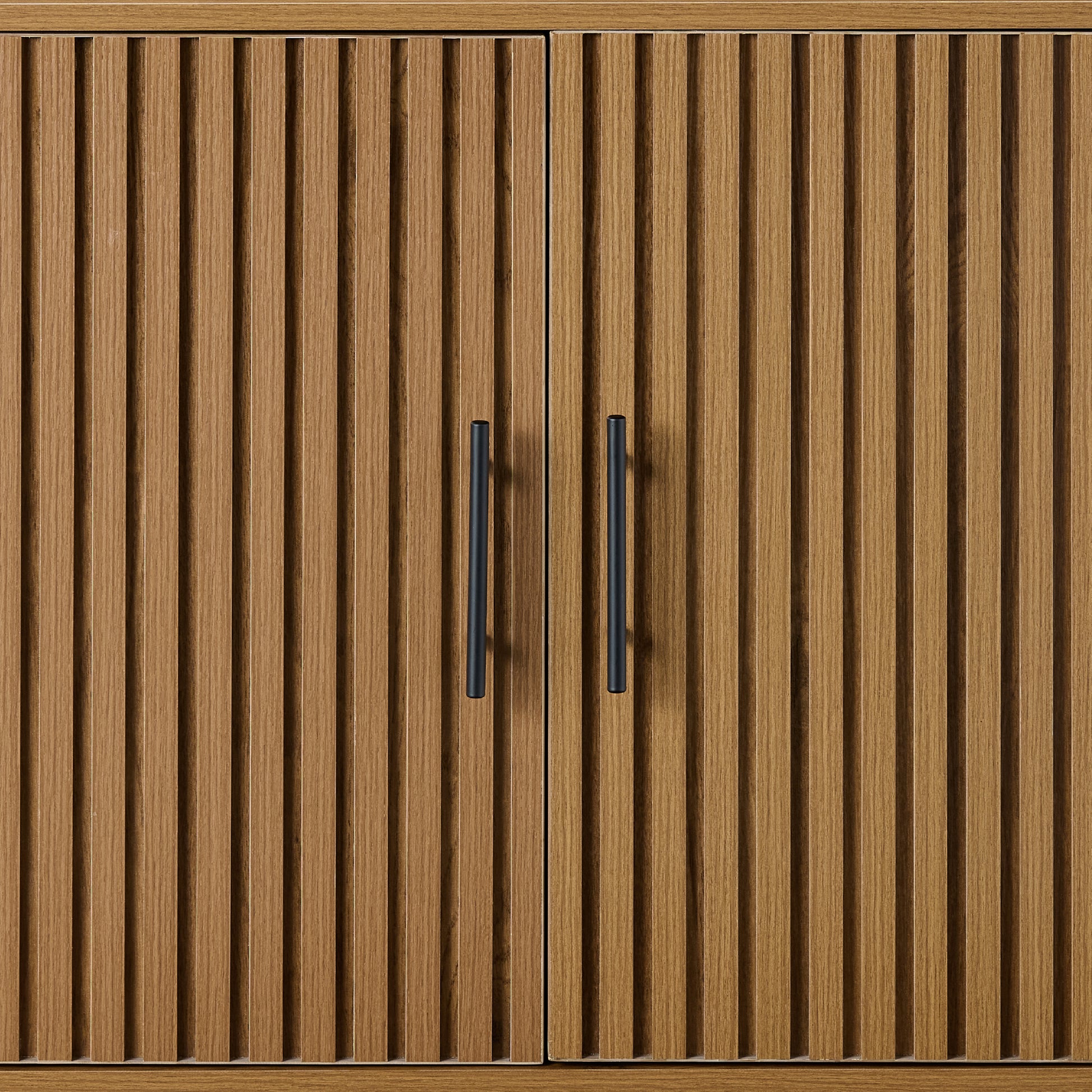 • SLATTED DESIGN WITH NATURAL WOOD GRAIN: Features slatted pattern on the doors, highlighting the wood grains while adding texture and depth to the modern style