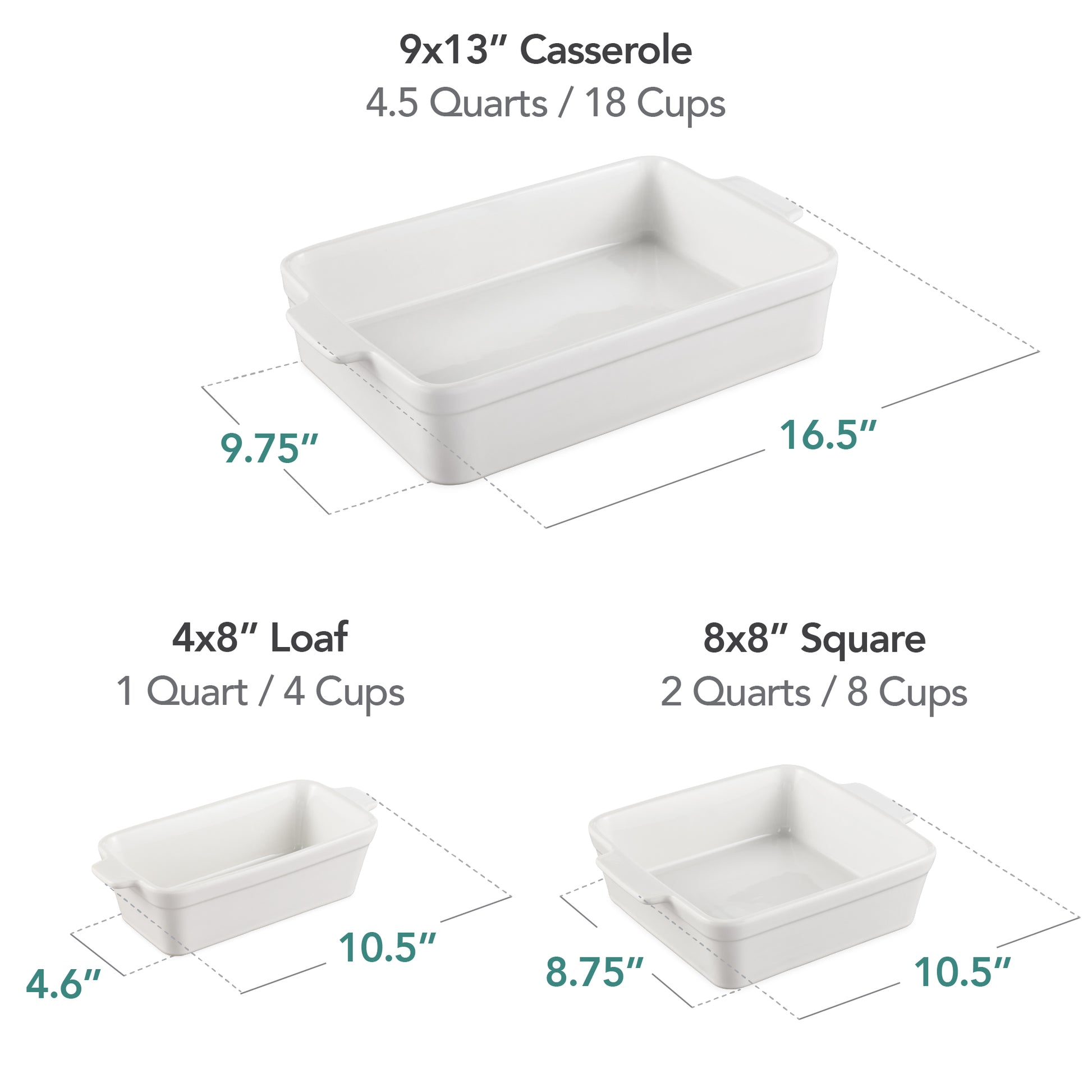• 3-PIECE BAKEWARE SET: Includes three standard-sized baking dishes-a casserole/rectangular dish, a square pan, and a loaf pan-designed to handle all your cooking, baking and serving needs