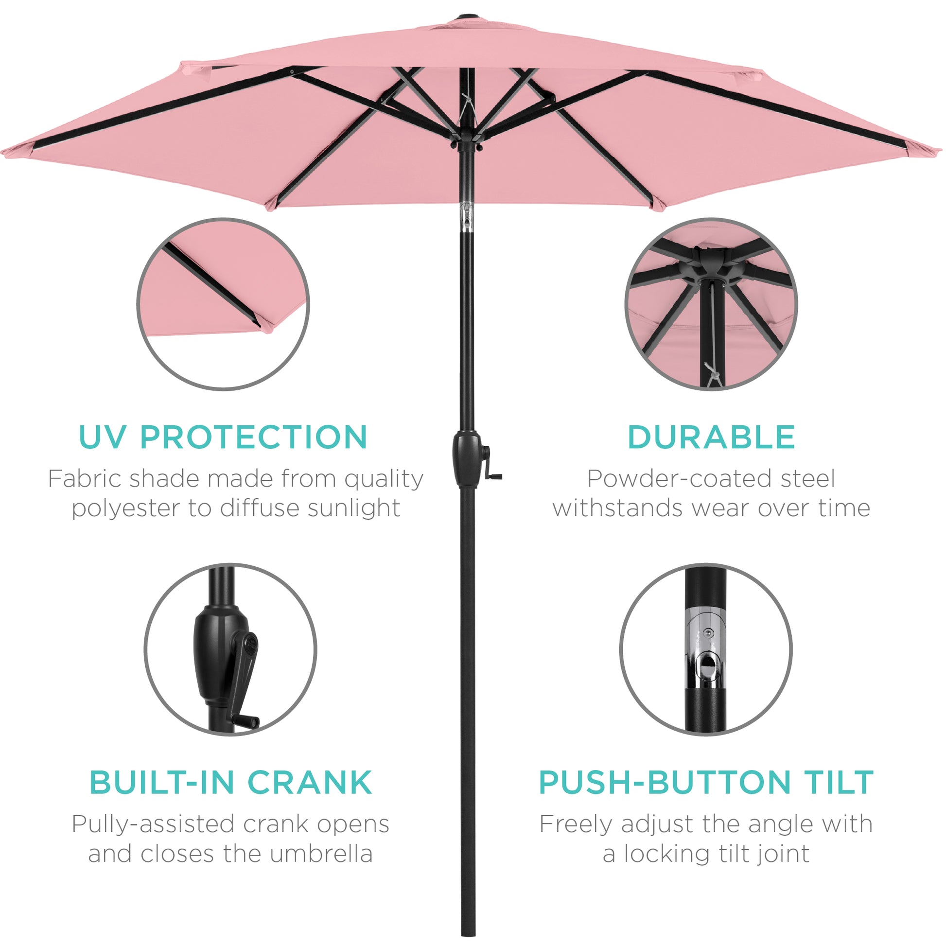 - USER-FRIENDLY MECHANISMS: Features a hand-operated crank to open and close the umbrella with ease, while a push-button tilt system adds extra security against the sun