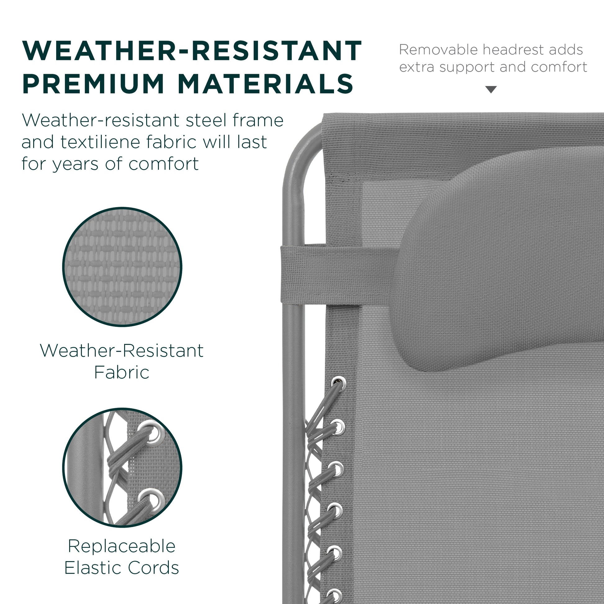 • WEATHER-RESISTANT MATERIALS: UV- and weather-resistant textilene fabric combined with a steel frame and replaceable elastic bands provide years of superior seating