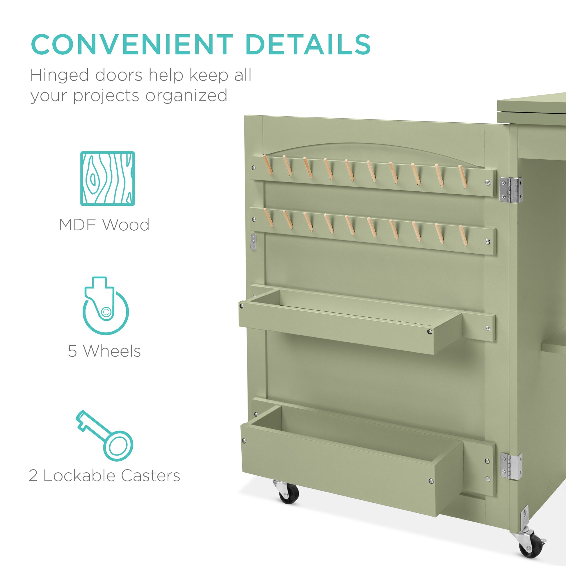 • CONVENIENT DETAILS: MDF wood build with metal hinges provide a wobble-free experience while lockable wheels and magnetic door locks keep supplies from falling out when moving