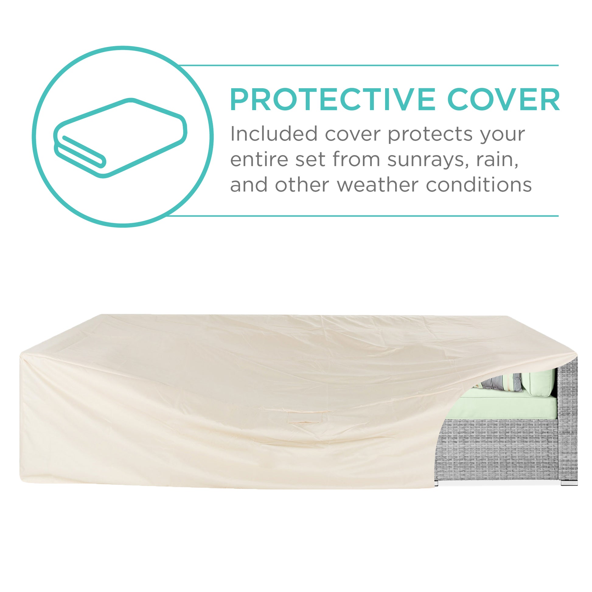 - Includes: (6) Sofa chairs with cushions, Table, (2) Accent pillows, Cover, (10) Seat fastener clips