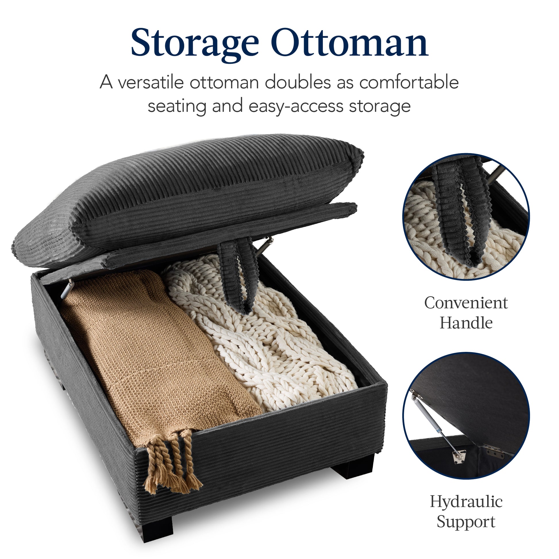 • OTTOMAN WITH STORAGE: The matching comfy pillowtop large ottoman has a 300-pound weight capacity, perfect for lounging and relaxation, and provides convenient storage for blankets, magazines, and other essentials to keep your living room tidy