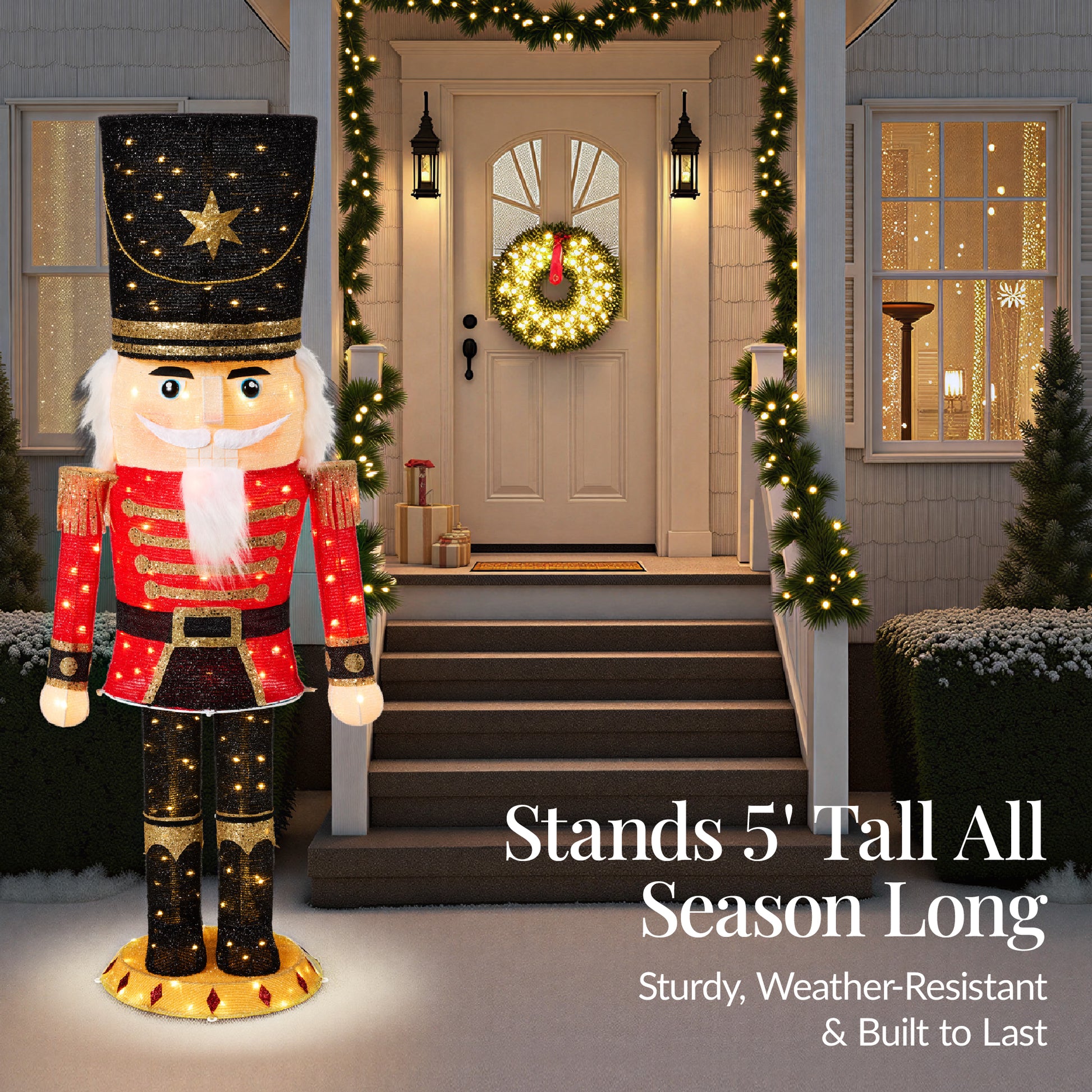 - ILLUMINATE YOUR CHRISTMAS: Brighten your holiday season with our 5-ft tall Lighted Outdoor Christmas Nutcracker - an impressive standout piece for any outdoor or indoor setup