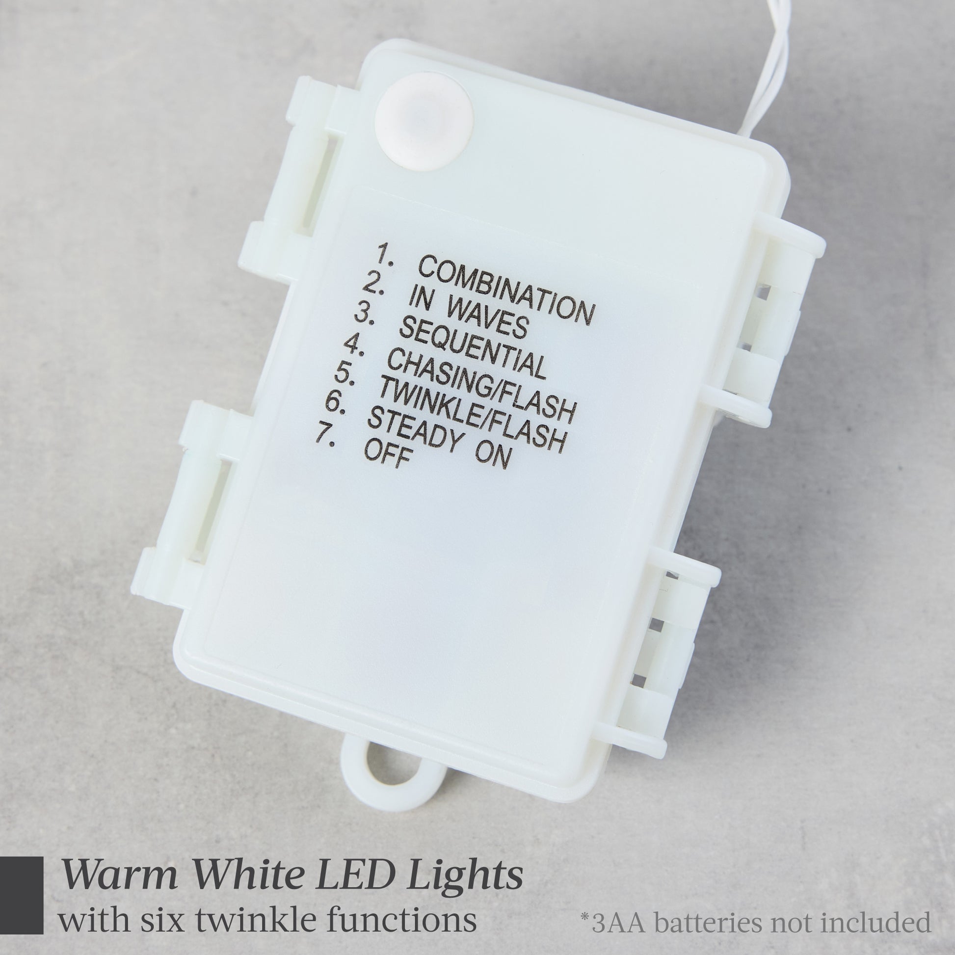 - BATTERY-POWERED TWINKLING LED LIGHTS: Our trees come pre-strung with 65 white LED lights, battery-powered and complete with a timer for season-long enjoyment; Note: Requires 3 AA batteries (not included)