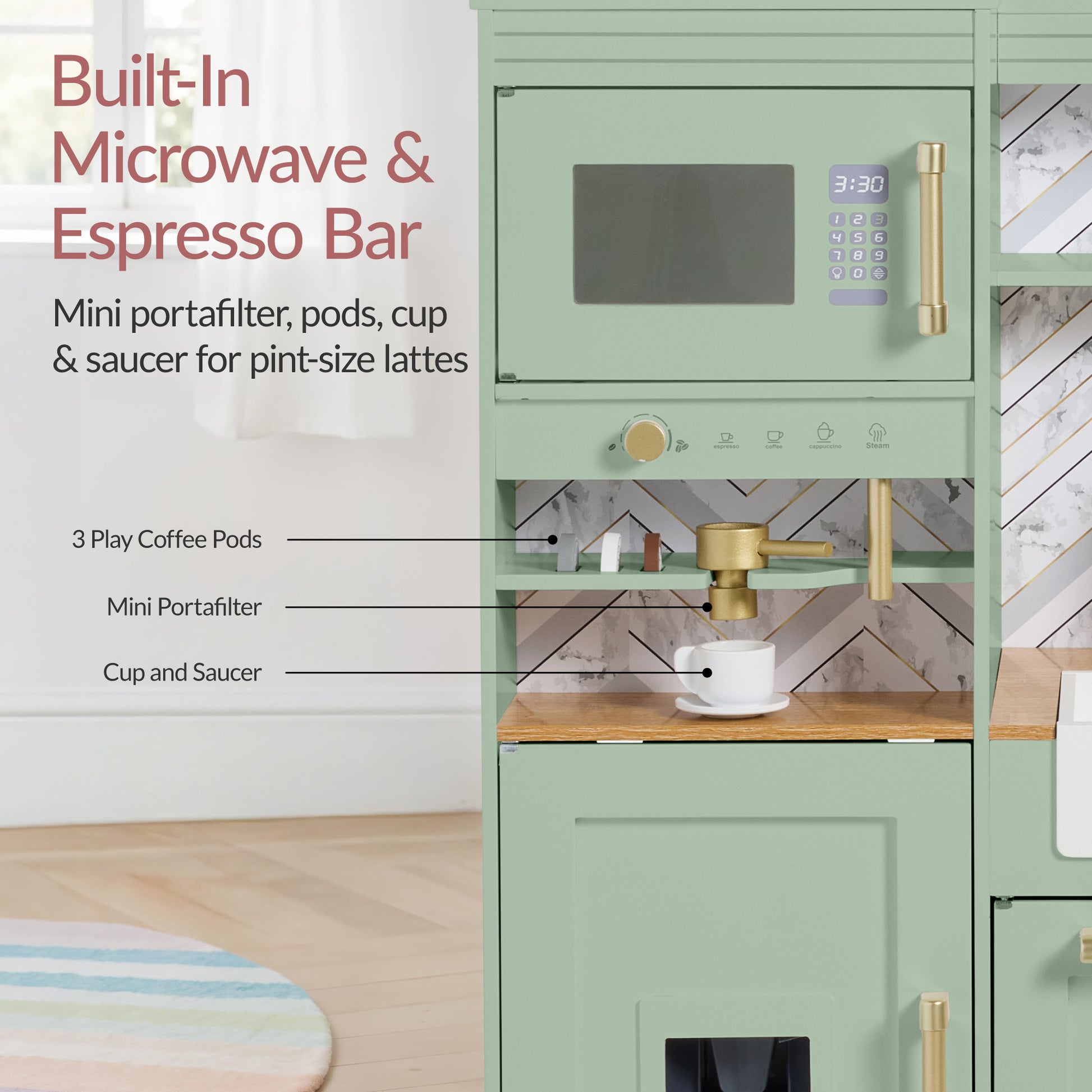 • BUILT-IN MICROWAVE & ESPRESSO MAKER: Interactive features such as a built-in microwave, espresso bar, coffee pods, coffee cup, saucer, and portafilter inspire hours of imaginative fun and role-play