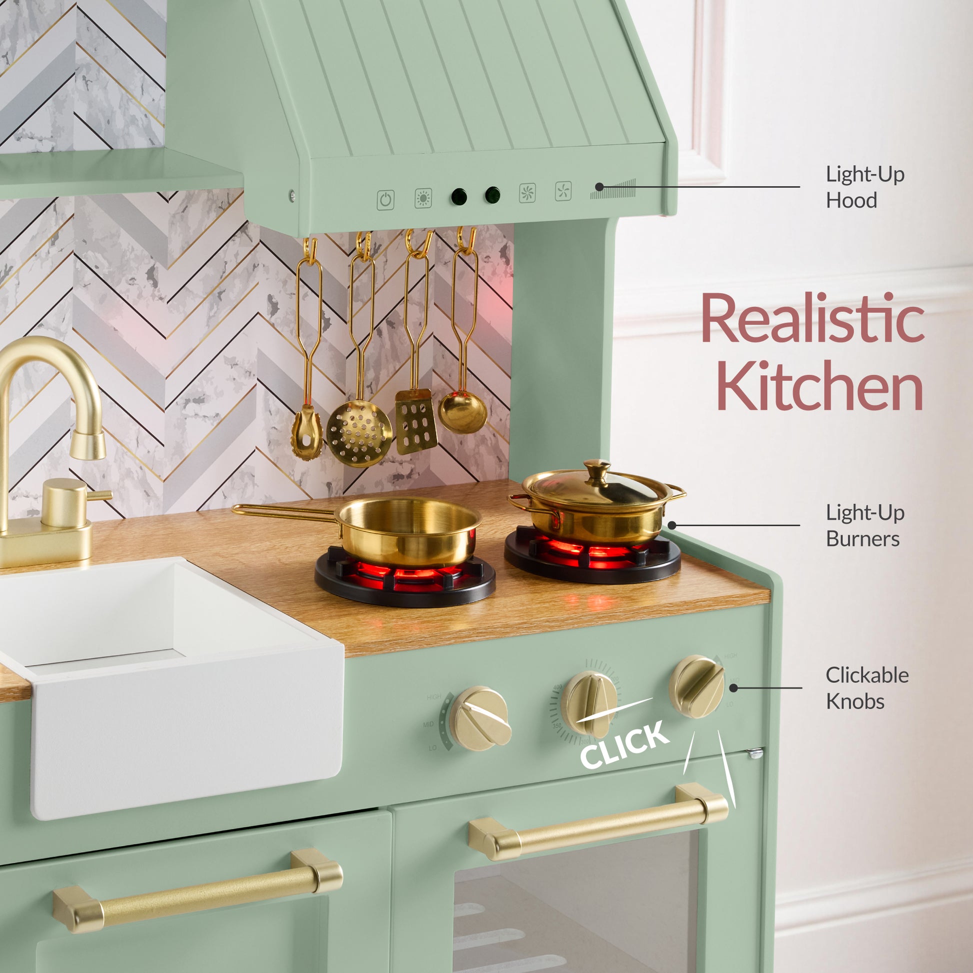 • REALISTIC COOKING FEATURES: Light-up stovetop burners and clickable knobs offer lifelike sounds and lights - plus 4 utensils and 2 pans for complete pretend cooking play