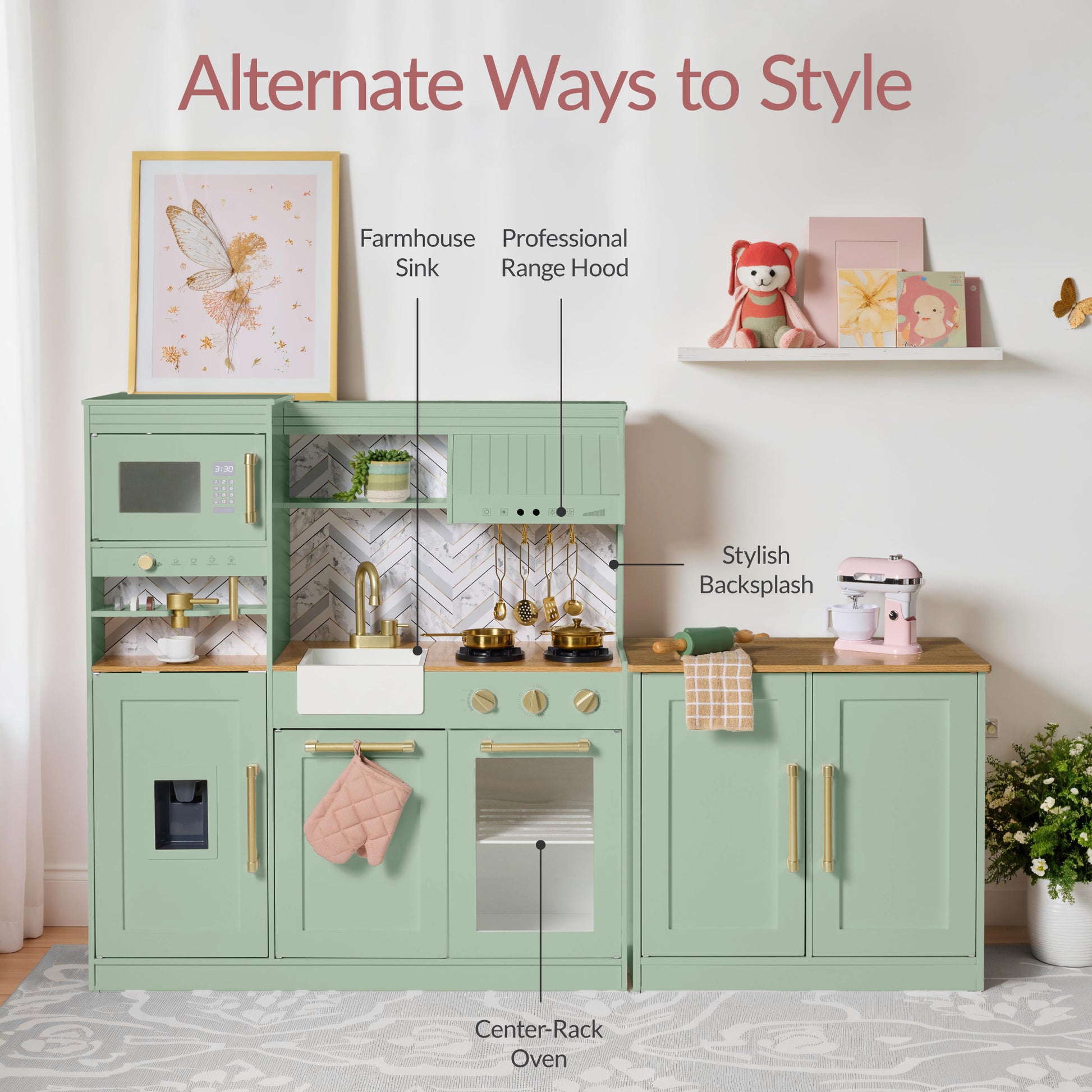 • DELUXE SHAKER-STYLE KITCHEN SET WITH FUNCTIONAL ISLAND: Features shaker cabinets, gold hardware, and a movable island with storage cubbies and towel rack for stylish, organized play