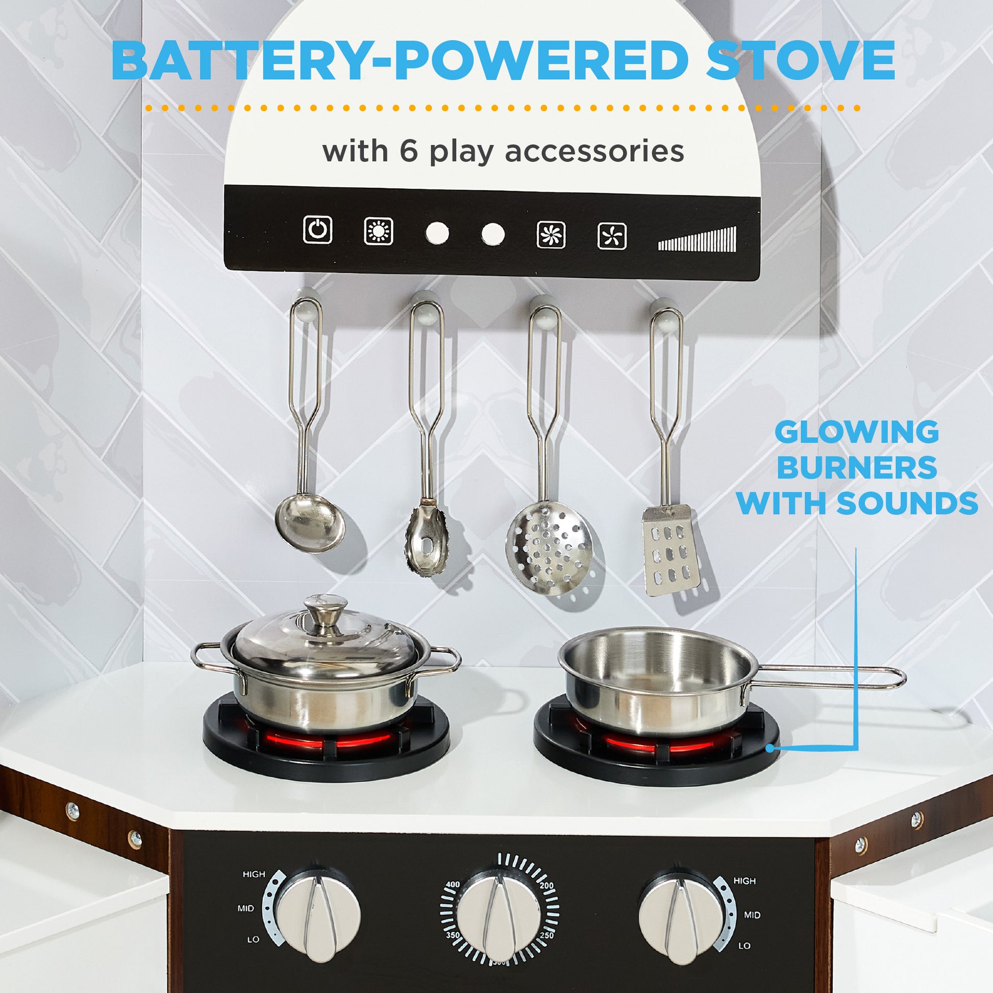 - TRUE-TO-LIFE KITCHEN: This includes a built-in play microwave and oven with clicking knobs, a light-up hood that mimics authentic sounds, and a battery-powered ice dispenser and stove for an immersive, interactive experience
