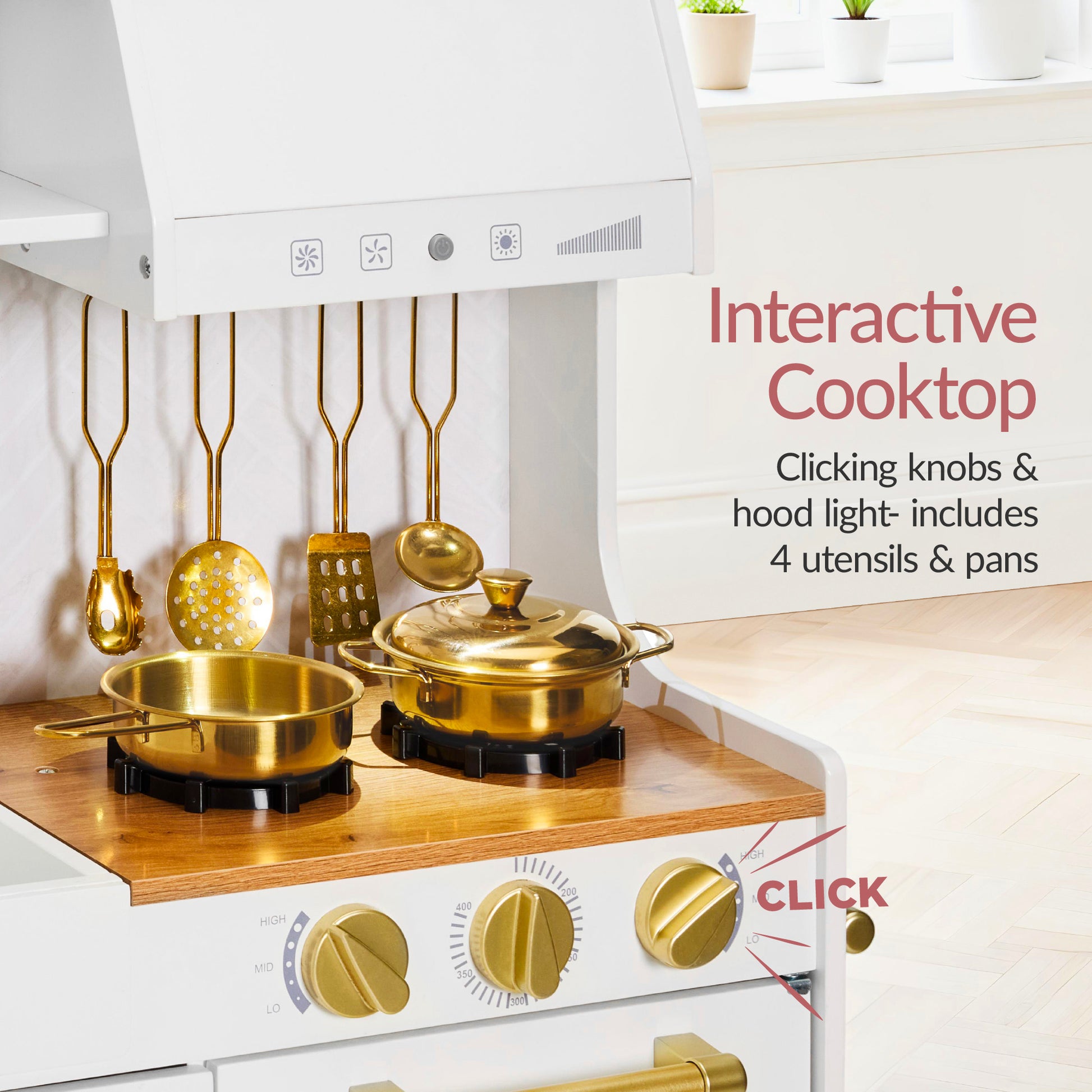 - REALISTIC COOKING FEATURES: Light-up stovetop burners and clickable knobs offer lifelike sounds and lights - plus 4 utensils and 2 pans for complete pretend cooking play