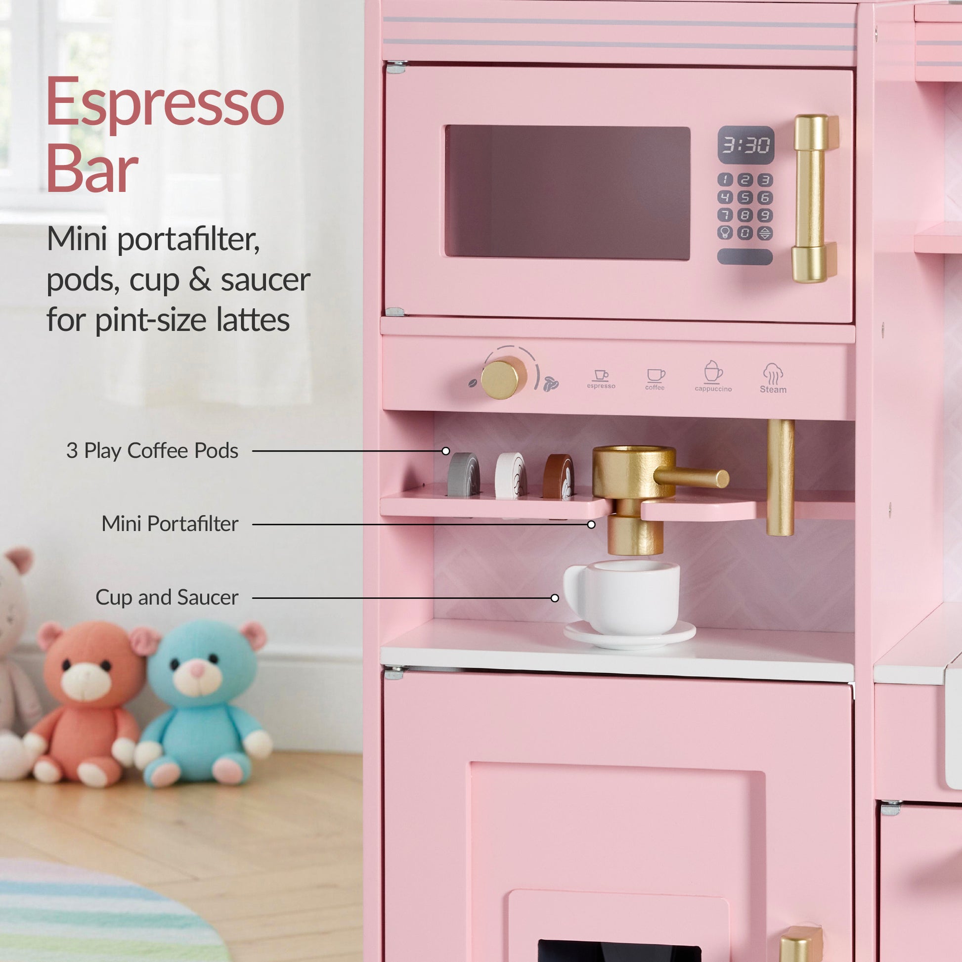 • BUILT-IN MICROWAVE & ESPRESSO MAKER: Interactive features such as a built-in microwave, espresso bar, coffee pods, coffee cup, saucer, and portafilter inspire hours of imaginative fun and role-play