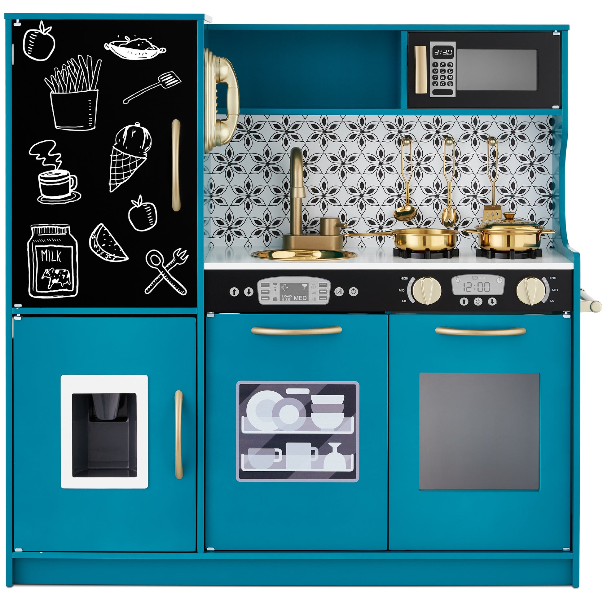 • CHALKBOARD SURFACE: Little chefs can jot down notes on the chalkboard surface as they play with this large set made with a realistic design that mimics a real kitchen, designed for their size, and have fun playing with the ice maker, microwave, phone