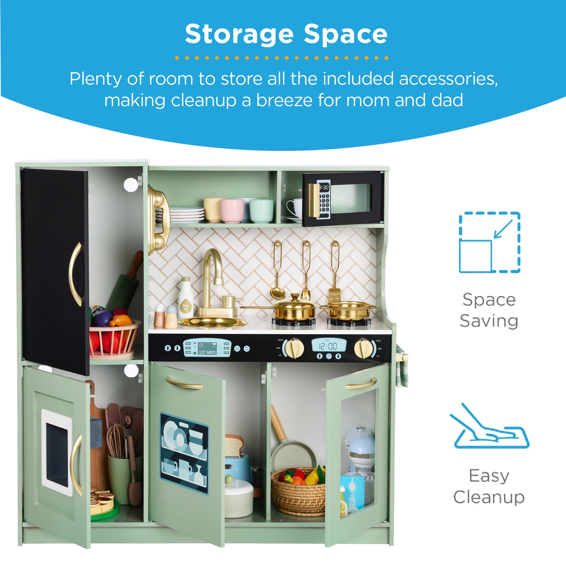 - CHALKBOARD SURFACE: Little chefs can jot down notes on the chalkboard surface as they play with this large set made with a realistic design that mimics a real kitchen, designed for their size, and have fun playing with the ice maker, microwave, phone