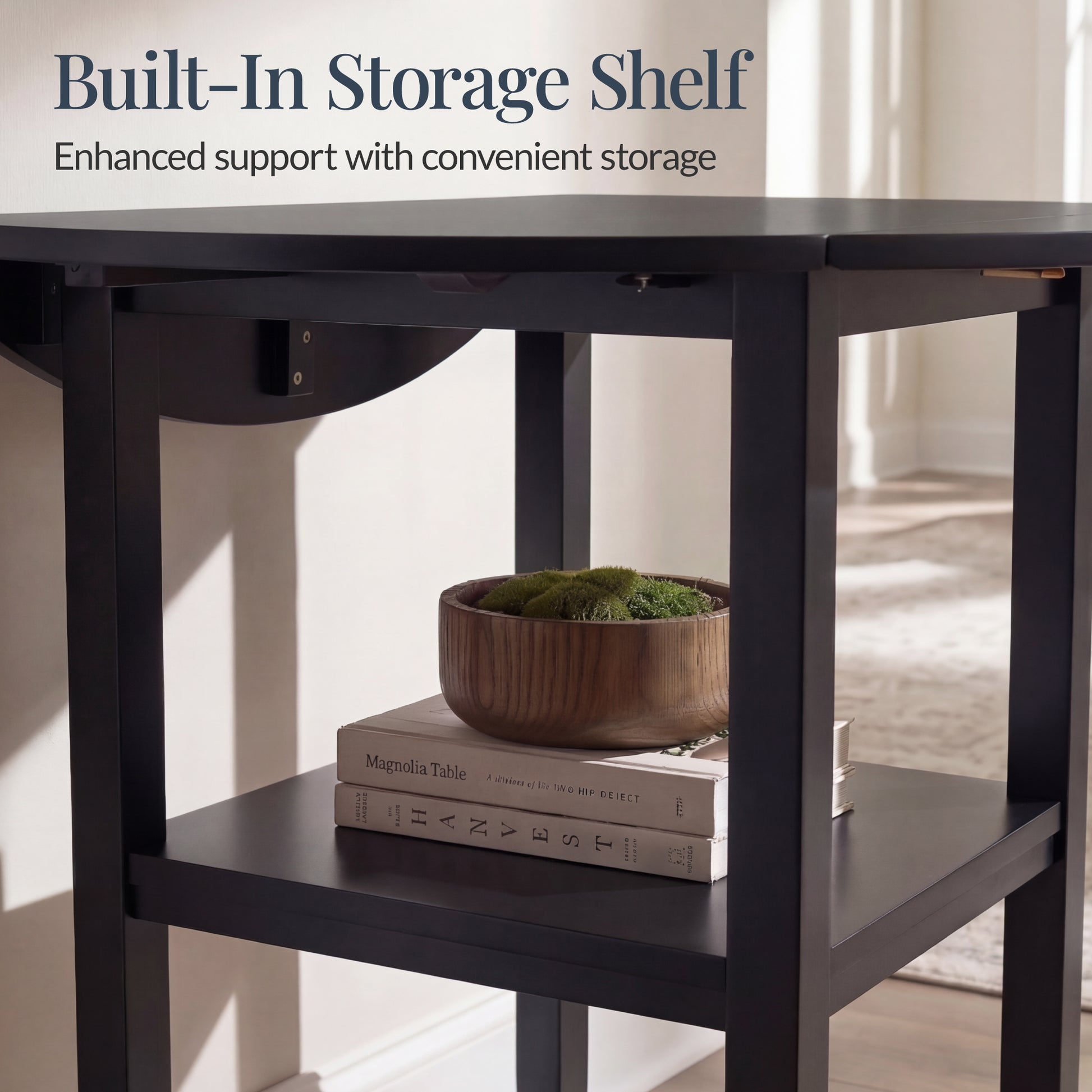• BUILT IN STORAGE SHELF: Integrated shelf below the tabletop provides convenient space for placemats, dishes, or decor making this apartment size dining table with leaf ideal for organized small spaces