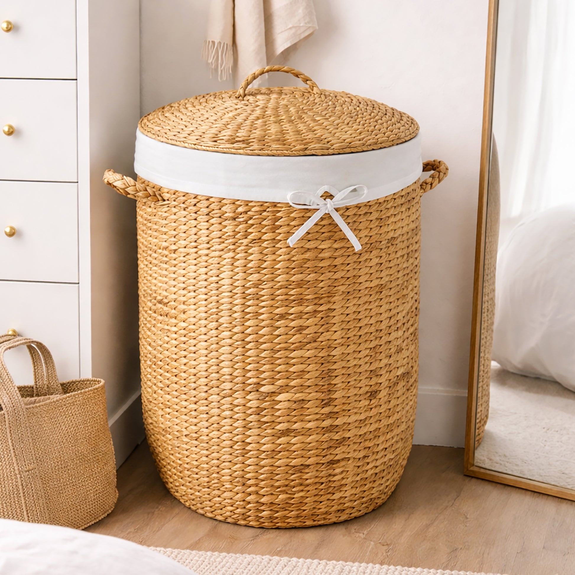 • DESIGNER STYLE TREND: Features a fold-over liner with a decorative drawstring bow for added charm, while the natural woven texture enhances any contemporary bedroom, living room, or nursery decor