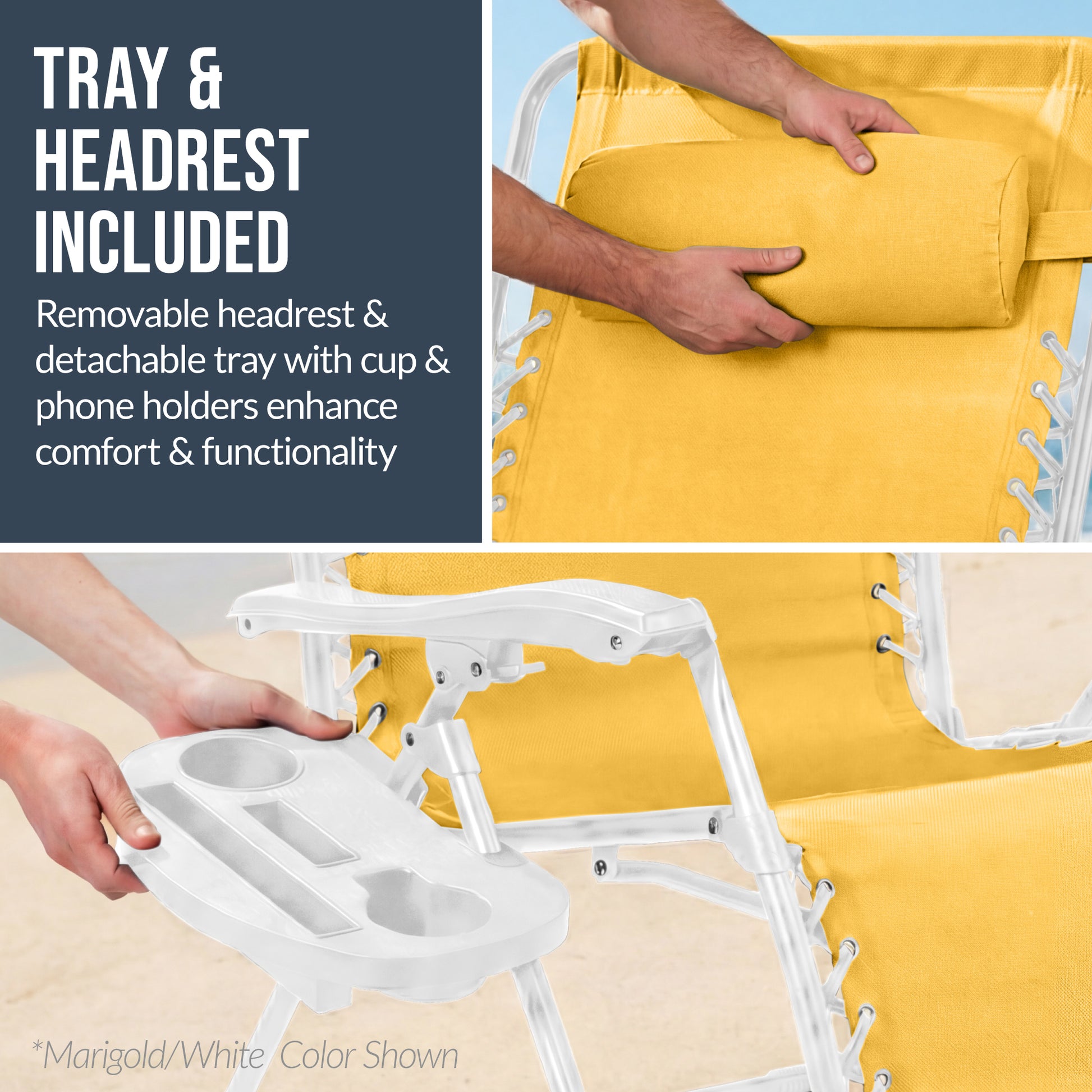 - Includes: (2) Zero gravity chairs, (2) Cupholder trays, (2) Headrest pillows