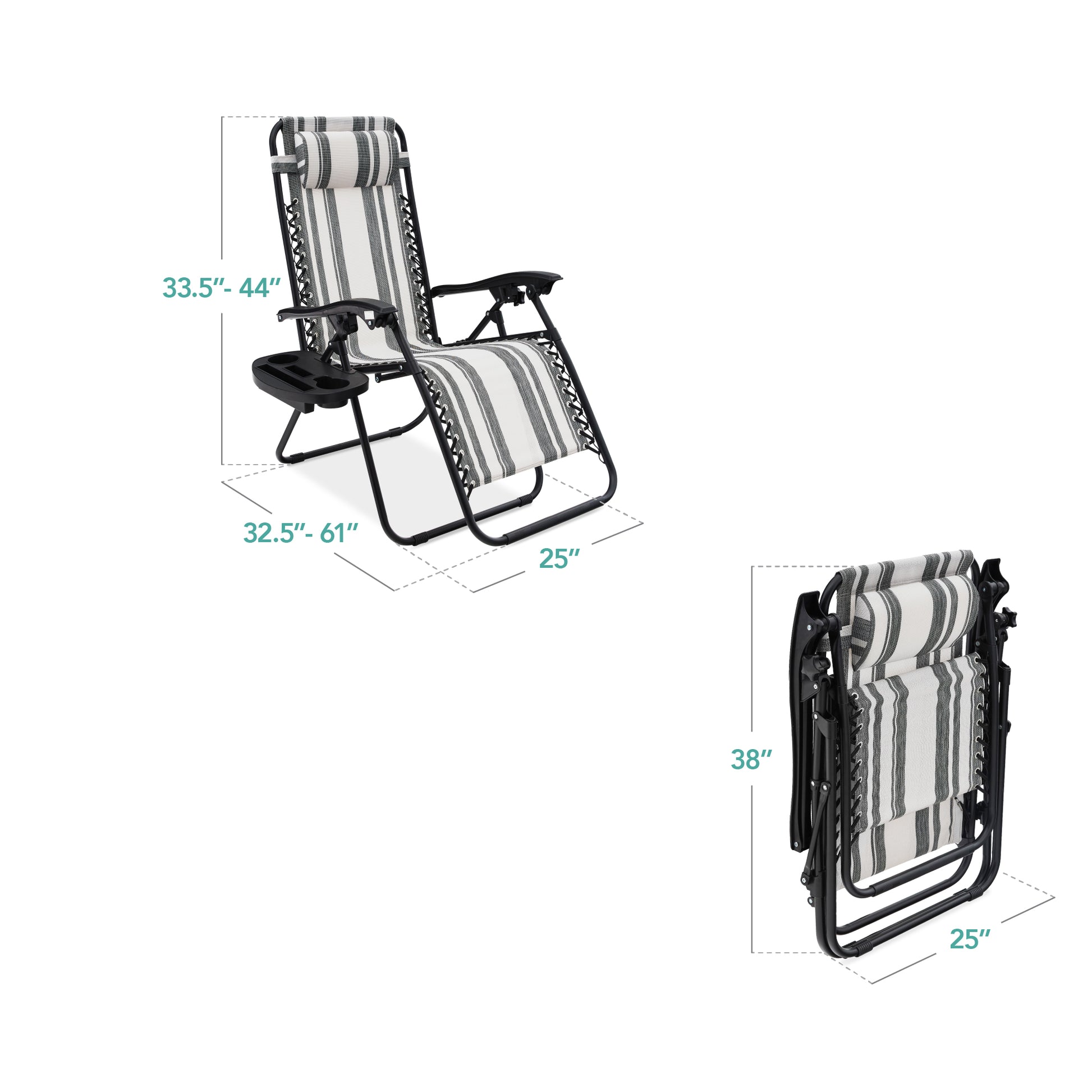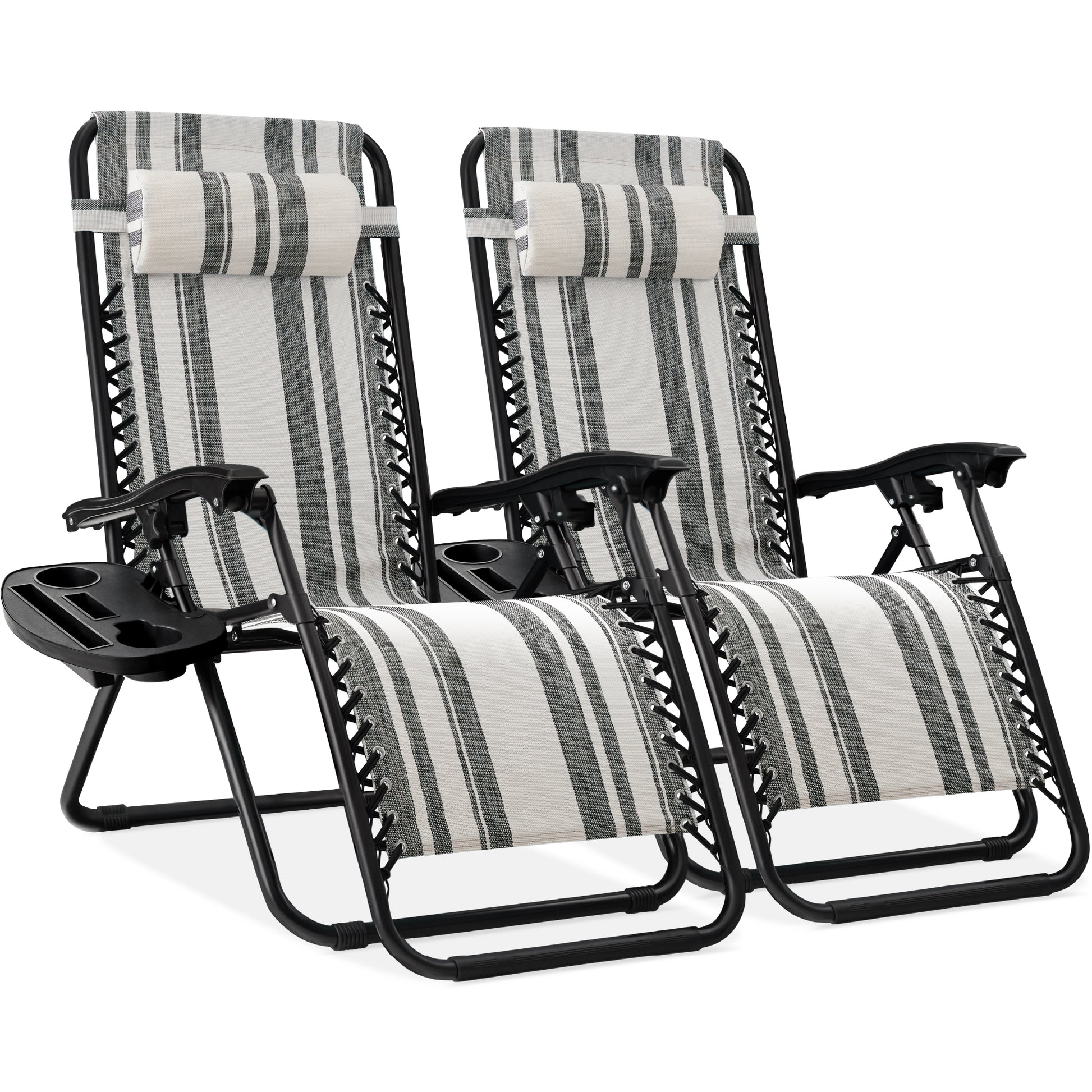 - Includes: (2) Zero gravity chairs, (2) Cupholder trays, (2) Headrest pillows