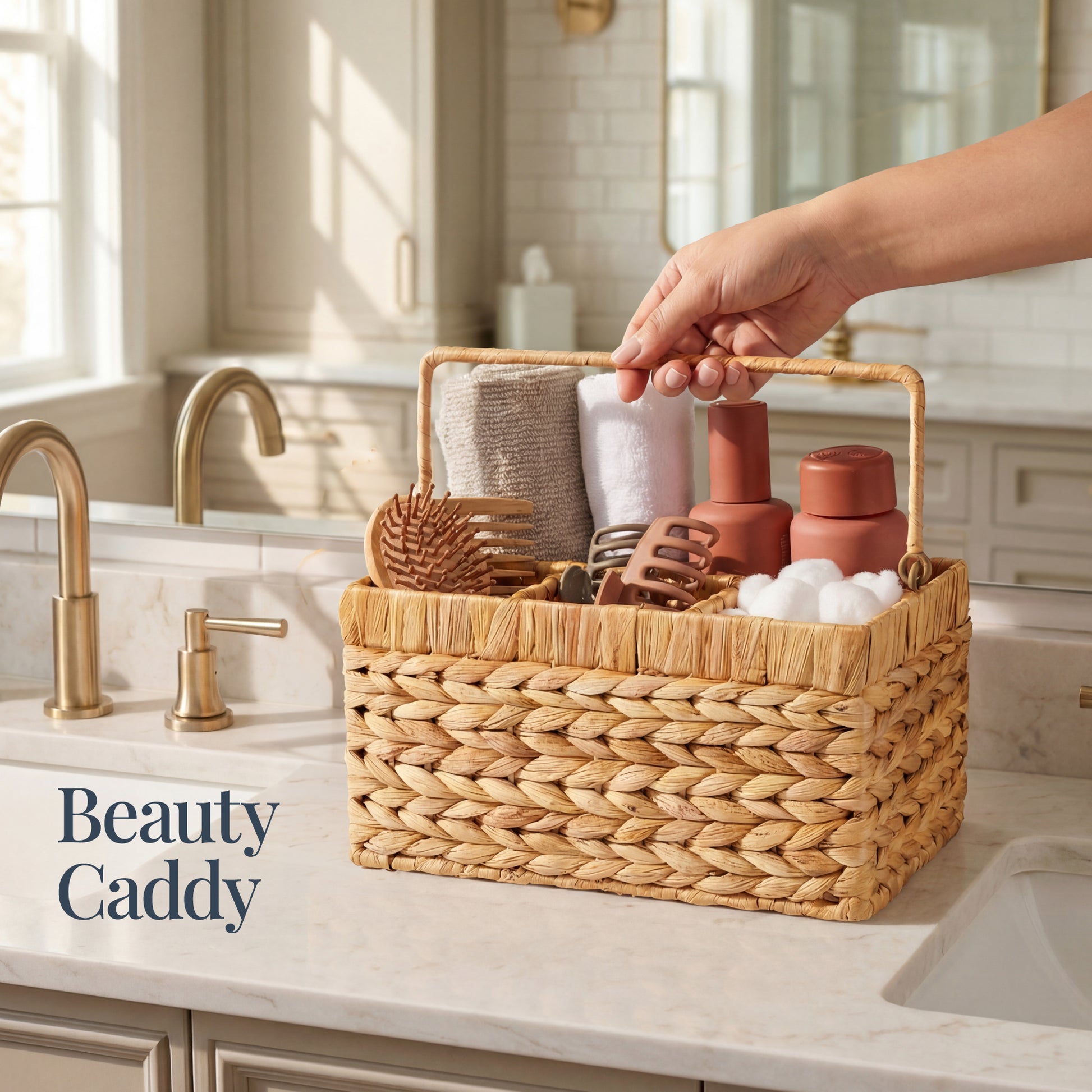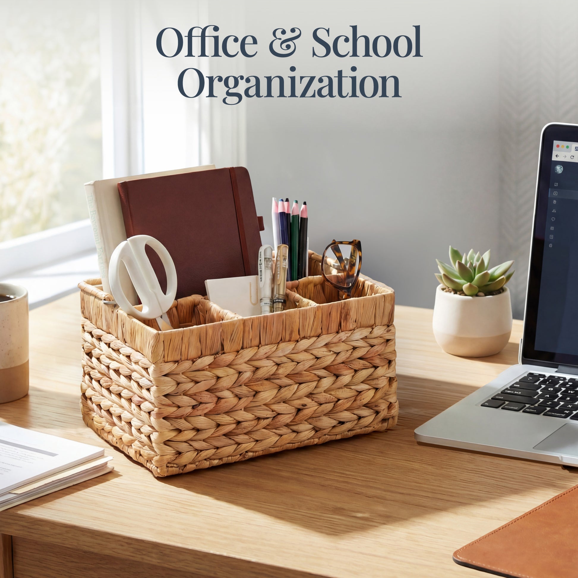 Utensil Caddy w/Handle - 4 Compartments, Woven Wicker Flatware Organizer